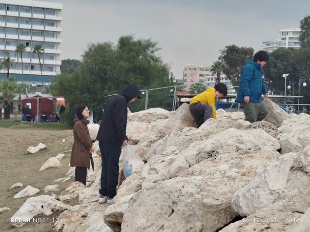 Larnaka, kamienie oddzielające teren portu od plaży, osoby pochodzenia azjatyckiego – turyści lub imigranci szukający miejsca do osiedlenia się, zdjęcie autorki, grudzień 2025.