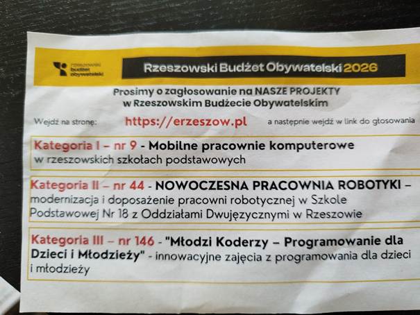 Ulotka zachęcająca do głosowania na zadania dotyczące wyposażenia szkół, tym razem finansowanie ma popłynąć z Rzeszowskiego Budżetu Obywatelskiego.