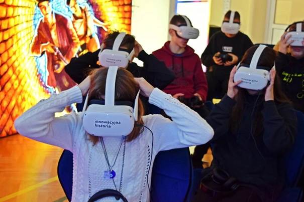 Uczniowie Szkoły Podstawowej nr 18 z Oddziałami Dwujęzycznymi w Rzeszowie podczas lekcji „innowacyjna historia”. Na zdjęciach widoczne gogle jeszcze innej marki (osobny program). Data pobrania 19.03 2025.